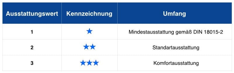 Der Ausstattungswert 1 stellt die Mindestausstattung dar, die gemäß DIN 18015-2 Elektrische Anlagen in Wohngebäuden, Art und Umfang der Mindestausstattung festgelegt und für Neubauten gefordert wird.